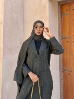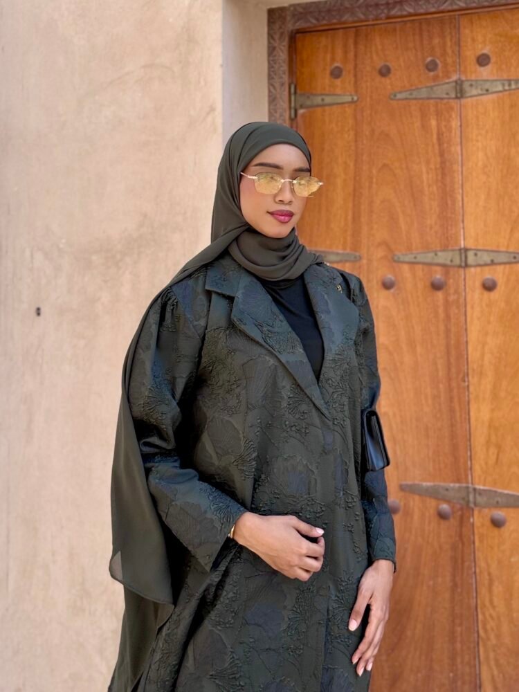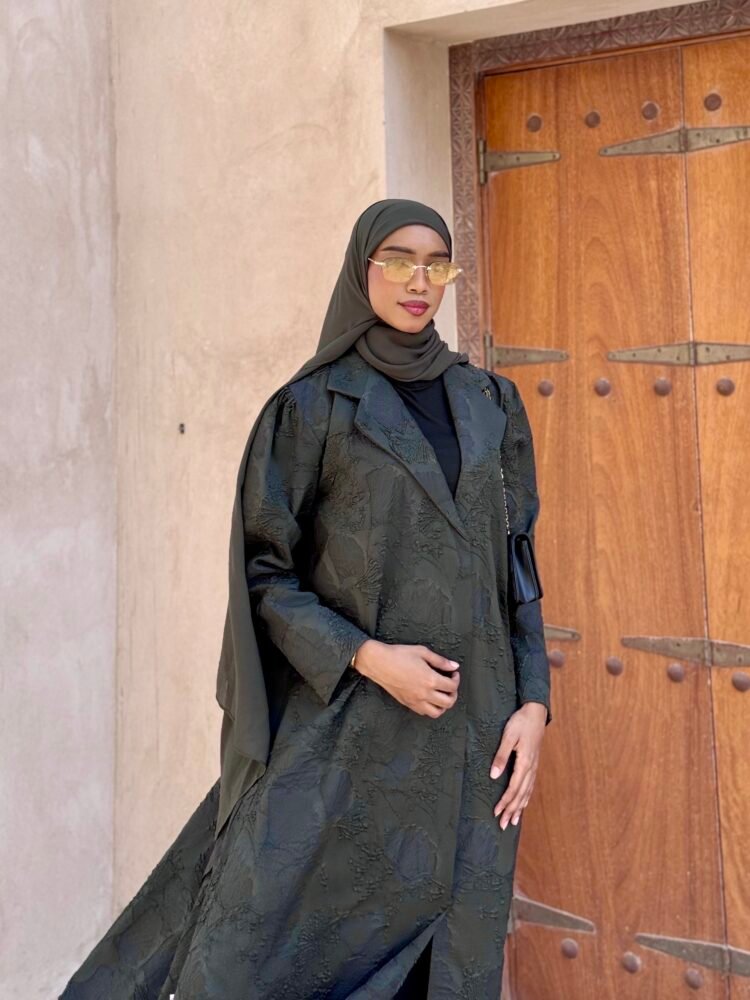 عشبة: 330🇦🇪، عباية فاخرة بلونين الأسود والزيتوني، بتفاصيل غنية ولمعة بسيطة